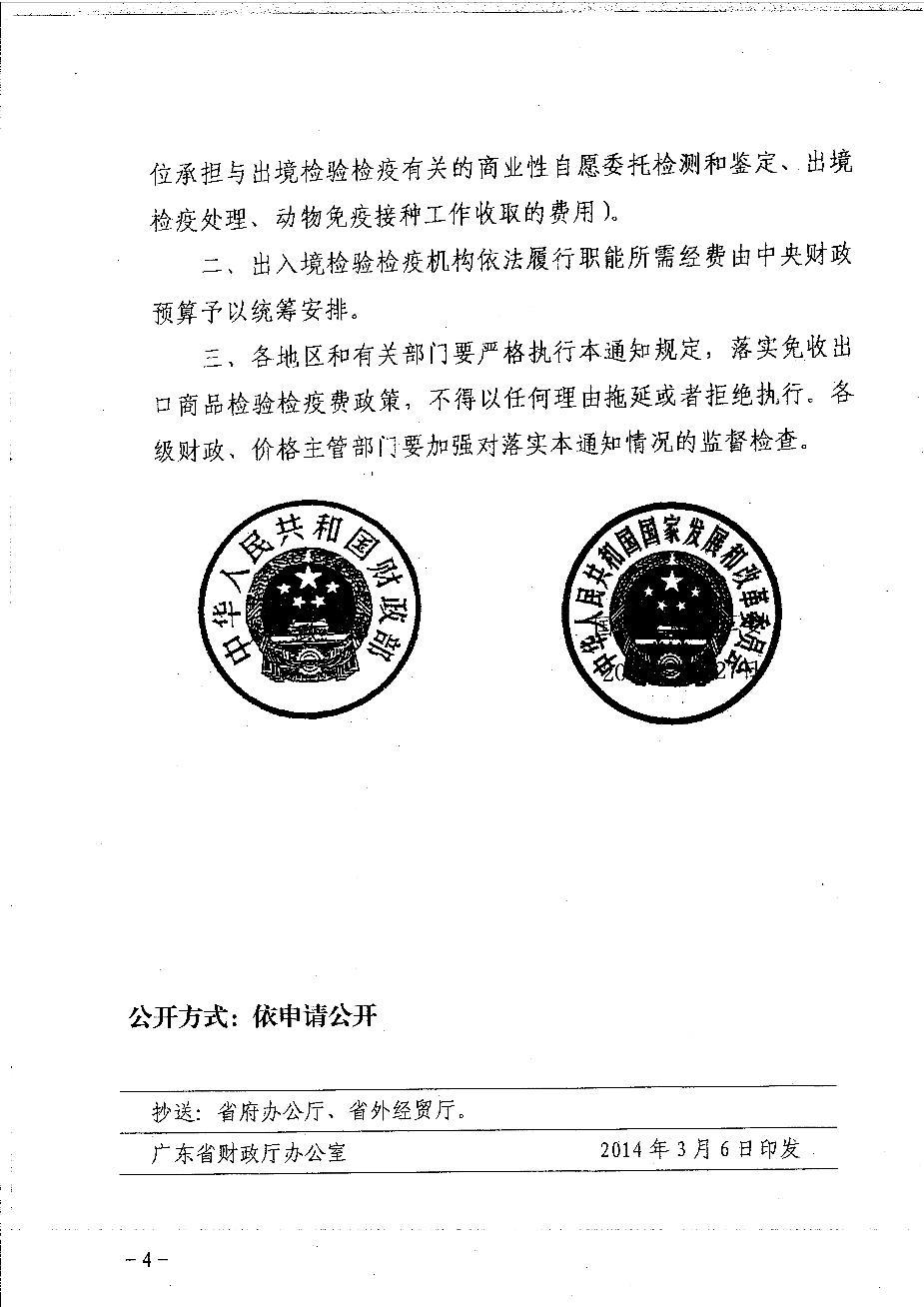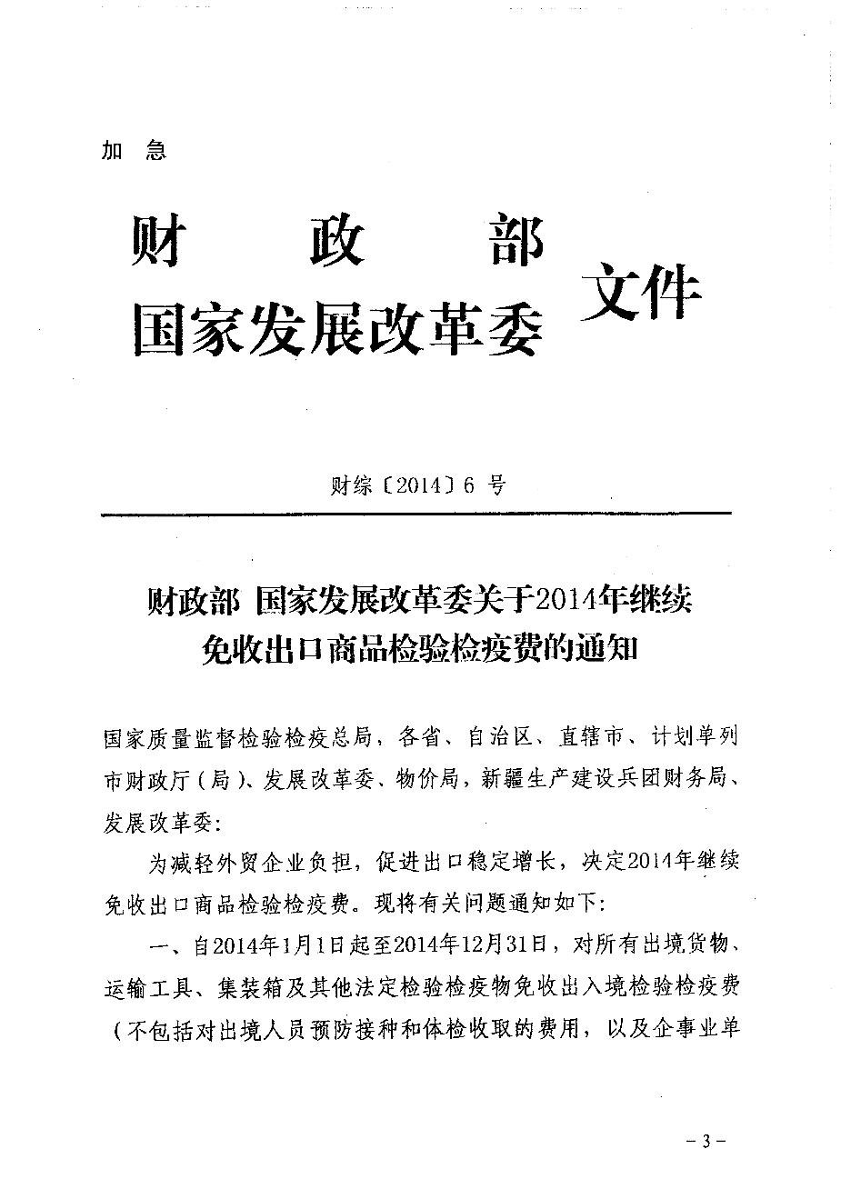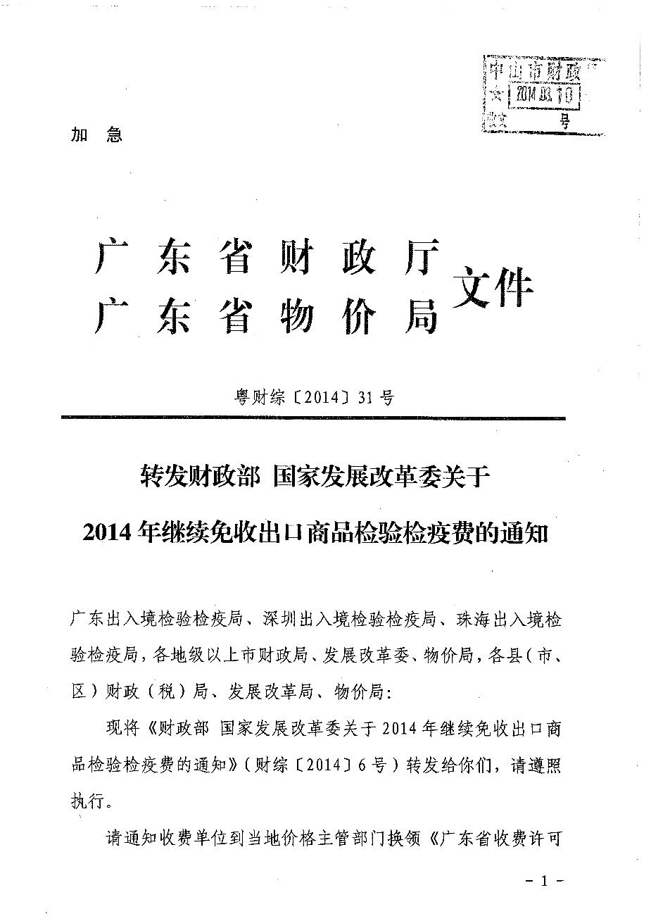 转发财政部 国家发展改革委关于2014年继续免收出口商品检验检疫费的通知(粤财综[2014]31号)