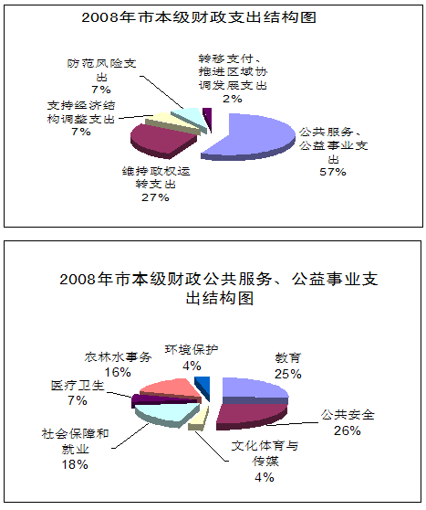 主要项目包括: 1、着力建设“经济强市”,加快经济增长方式转变,加大重点产业扶持力度:安排扶持产业发展专项资金2.37亿元,比2007年增加9700万元,其中,新增外贸促进专项资金2700万元,中小企业信用担保、名牌龙头企业发展专项资金1500万元,节能降耗、清洁生产发展专项资金250万元,商贸流通、工业购销专业市场专项资金500万元,农产品专业市场建设600万元;工业、服务业、科研共性技术(检测)服务平台增加1000万元、华南现代中医药城发展资金增加500万元,服务业发展专项资金增加1400万元,奖励类专项资金增加800万元;人才发展专项资金增至400万元,粮食风险基金增至3000万元,整合会展经费800万元。 2、着力城乡统筹,落实各项支农惠农扶持政策,促进新农村建设:新增农村道路硬底化建设及开通大面积耕地路桥资金5000万元,现代农业、渔业机械化建设550万元;农田水利基本建设专项资金增至934万元,恢复和发展粮食生产补贴增至940万元;安排西河水闸等农村水利工程建设2.29亿元,内河整治资金1亿元;加大对村级集体经济的扶持力度,安排2235万元扶持集体经济年纯收入100万元以下的经济后进村及老区建设。农林水事务同比增长15.76%(加上水利建设基金、新增建设用地有偿使用费等安排的农业支出,同比增长22.58%)。 3、着力解决基本民生问题,加大卫生社保支出,扩大政策受益面:新增城乡居民社区门诊基本医疗保险补贴3200万元;社区卫生服务经费(含社区卫生服务站建设)增至1500万元。卫生支出同比增长19.7%。安排农村养老保险基金、城镇社会保险财政专项补贴等社保资金2.17亿元,安排城乡社会救济及最低生活保障金2180万元,促进就业专项资金增至2000万元。社保支出同比增长21.02%。 4、着力提升全民素质,增加教育文化支出,完善公共服务体系:新增中等职业学校奖学金、助学金1000万元,教育现代化试点200万元;安排职业教育发展补助1200万元;免费义务教育补助经费增至7200万元,振兴初中经费增至1200万元,创建示范性高中专项经费增至1200万元。教育支出同比增长30.11%。新增孙中山研究和资源开发200万元,文物普查专项经费100万元,文化名城建设专项经费100万元;旅游宣传促销经费增至500万元,图书馆购书经费增至460万元。文化体育与传媒同比增长24.52%。 5、着力保障平安,维护公共安全,促进平安中山建设:加大食品药品、交通、公安等领域的投入,新增食品药品整治专项经费200万元;安排健全农业标准体系、检测体系和质量认证体系资金1300万元,公安、交警、边防、消防、武警等部门装备购置与维护3535万元,继续安排社会治安视频监控系统及政法网建设经费3000万元,安全生产专项资金600万元。公共安全支出同比增长28.39%。 6、着力改善生态环境,增加环保和基建投入,建设宜居城市:预算内安排基建支出2.7亿元,同比增长125%,重点推进网络化交通基础设施工程、第二人民医院、纪中、一中初中部、中山中专、广东理工职业学院、高职院三期等项目建设;专项规划及调研经费增至3000万元;加大环保投入,新增第一次全国污染源普查专项经费283万元;镇区污水处理厂建设补助增至1.5亿元,市污水处理厂补贴增至4000万元,生态市建设专项经费增至100万元。继续安排海岸红树林造林、生态公益林效益补偿、四旁绿化等林业专项经费4000万元;安排城维费1.8亿元,同比增长38%。环保支出同比增长30.62%。 7、着力协调社会发展,增加社会事务支出:新增村(居)两委实绩考核专项经费500万元、农村基层组织建设经费200万元,妇女民生直通车经费200万元;安排两新组织党建工作经费552万元、法律援助补助经费120万元;青年志愿者协会活动经费及社区志愿事业发展专项基金增至130万元,国家赔偿经费增至150万元。 8、着力推动区域经济协调发展,加大转移支付力度:安排转移支付资金1.2亿元,对民众、阜沙、神湾、大涌等镇进行重点帮扶。 9、着力提高干部队伍素质,规范津补贴制度:预留机关事业单位规范津补贴经费3.7亿元,预留增人增资经费7600万元;干部培训经费安排3600万元,同比增长44%。 10、着力防范财政风险,健全政府债务管理机制:安排防范金融风险及偿债准备金3.6亿元,同比增长29%。确保预备费符合《预算法》的规定,2008年安排1.55亿元,同比增长46%。 (三)市本级预算内基金预算草案。2008年市本级基金收入计划622373万元,其中:国有土地使用权出让金收入592388万元,城镇公用事业附加收入16000万元;文化事业建设费收入1000万元;地方水利基金收入9100万元;其他基金收入3885万元。加上年结余57605万元和上级补助9993万元,合计689971万元。支出安排657780万元,其中:国有土地使用权出让金支出613388万元(含市级支出81000万元,用于农业开发、社会保障、基本建设支出、经济适用房建设及土地储备等方面),收支相抵,结余32191万元。 (四)金融风险金。到目前为止,我市尚有8.4亿元中央再贷款未偿还,每年约需归还4.2亿元,为确保我市按时归还中央再贷款和防范化解地方金融风险,预算安排从多渠道筹集金融风险金,包括:预算内安排2亿元;从各项行政事业性收费及经营服务性收费按10%提取金融风险金6000万元;火炬开发区、南朗镇等实施一级财政体制的镇区上缴金融风险金2000万元;金融资产回收处置收入上缴1.4亿元。 三、坚持改革,不断创新,将财政管理提高到一个新水平 2008年,财政工作总的形势是机遇与挑战