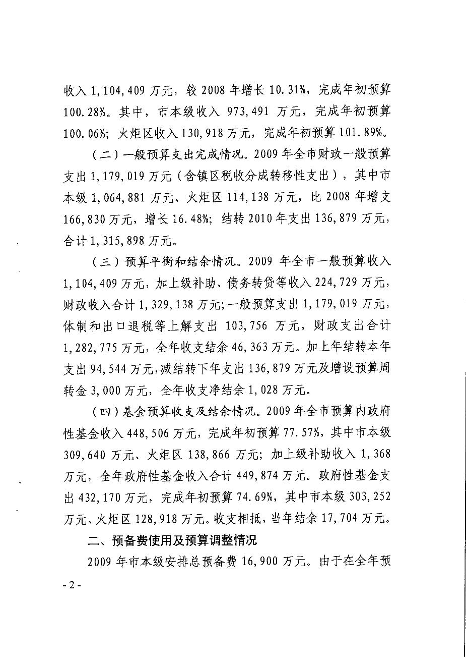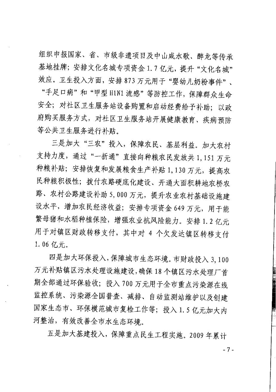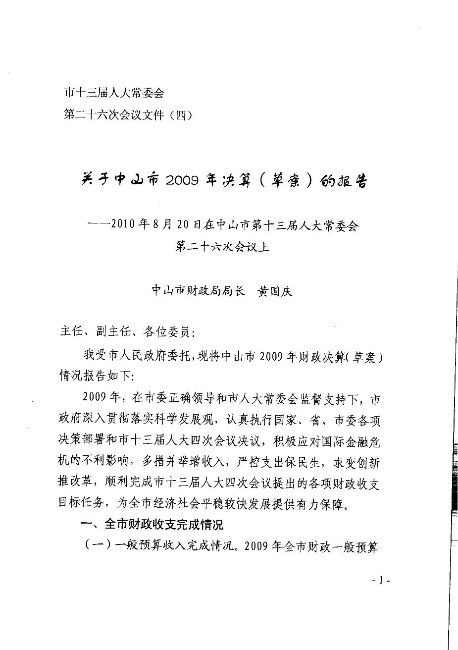 2009年中山市财政决算报告